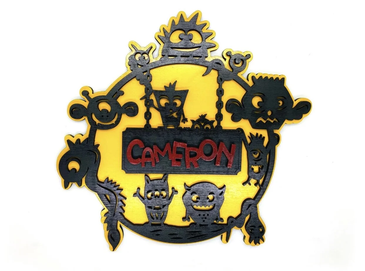 Check out this adorable animated monster round. This is perfect as a shelf topper or as a wall/door hanging. They come with your choice of either a wall bracket or a stand. They run approximately 10.8 inch tall, you choose your stain or paint color, as well if you would like a single layer with out a backer or a 3D Version - 3 Layer piece.
